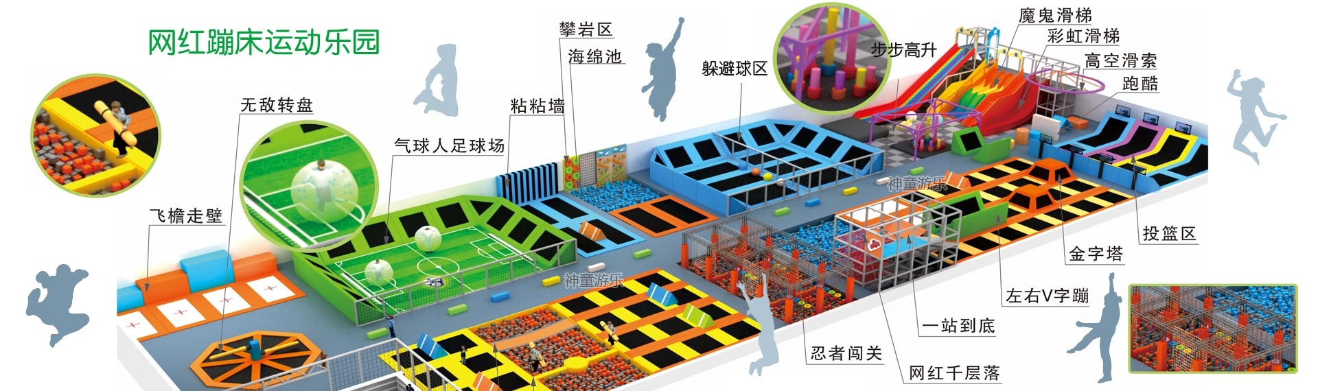 神童提供整場規劃設計(裝修設計、平面規劃與VI設計、3D整場效果設計等)與兒童游樂設備、兒童蹦床、充氣城堡、大擺錘等設備生產供應,后期場地運營指導,加上完善的售后服務,專注于提高游樂場的持續盈利能力!